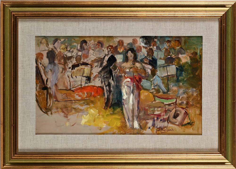 Alfredo Del Sordo Otranto 1905 - Roma 1961 La cantante e il complesso musicale Firmato: 'A del Sordo' in basso verso destra. olio su legno cm 25 x 42,5 - in cornice cm 42 x 58,5