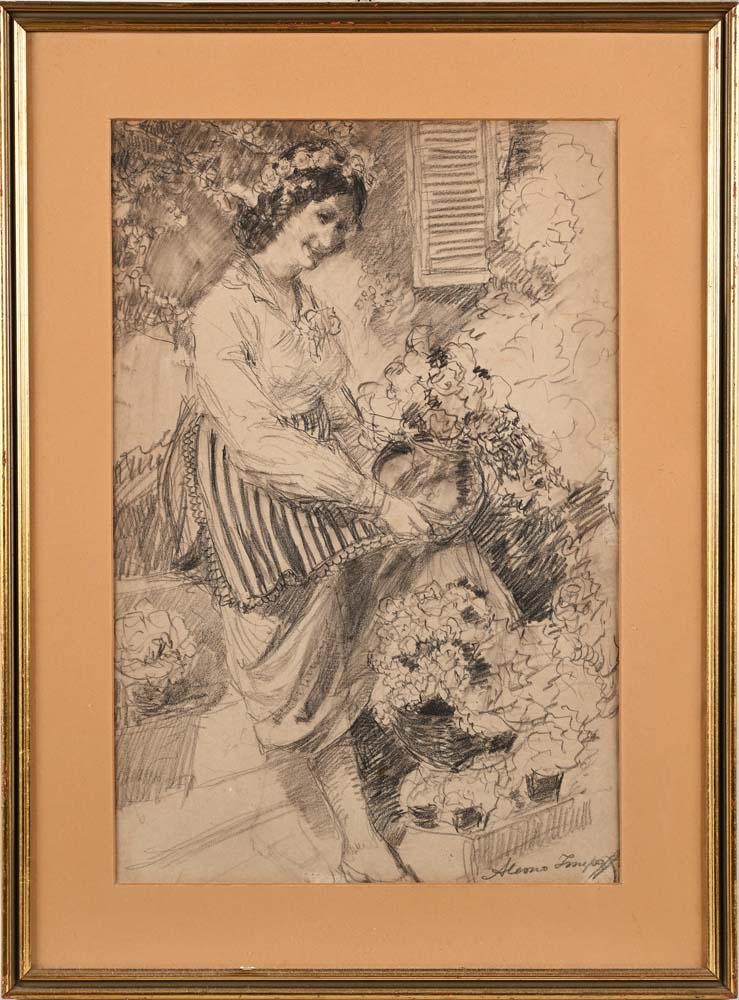 Alessio Issupoff Vjatka 1889 - Roma 1957 donna tra i vasi di fiori Firmato: 'Alessio Issupoff' in basso a destra. carboncino su cartoncino cm 42,5 x 28,5 - in cornice cm 56 x 41,5