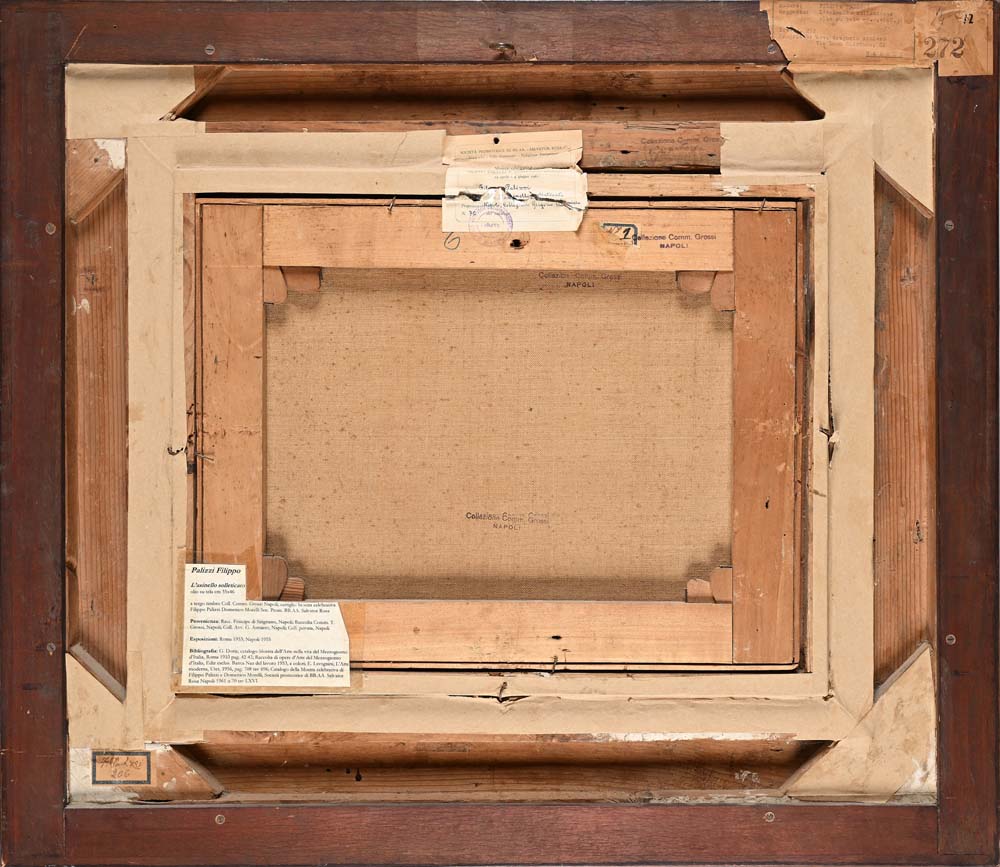Sul retro: cartellino dattiloscritto con autore, titolo, proprietà (Avv. Gregorio Armiero, Napoli) e numero di riferimento (272); cartellino a stampa 'Società Promotrice di BB. AA.' "Salvator Rosa" di Napoli per la mostra celebrativa "Filippo Palizzi e Domenico Morelli" tenutasi a Napoli nel 1961, con riferimenti al dipinto e numero (n. 70); timbri 'Collezione Comm. Grossi di Napoli'; cartellino con antico numero di riferimento (206). Olio su tela cm 35,5 x 46 - in cornice cm 68,5 x 78 Raccolta del Principe di Sirignano, Napoli;