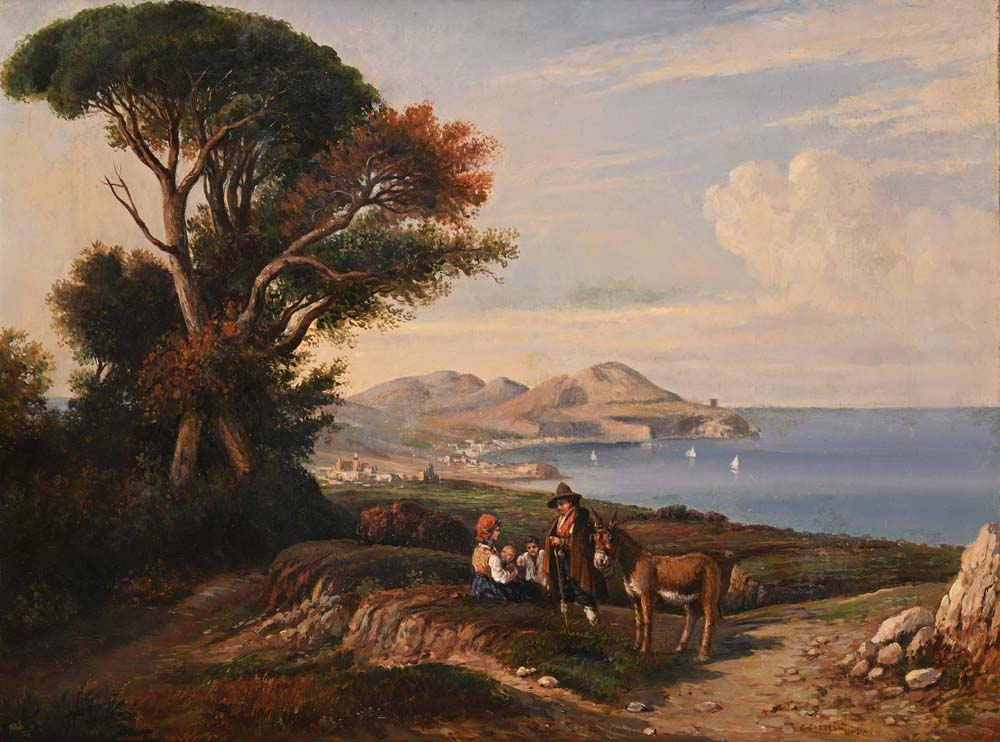Consalvo Carelli (attribuito a) Napoli 1818 - Napoli 1900 Panorama della costiera con famiglia di contadini in sosta Firmato in basso a destra. 'C. CARELLI / NAPOLI'. Olio su tela cm 43 x 56 - in cornice cm 67 x 80