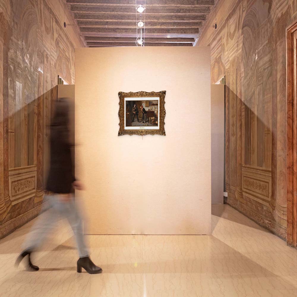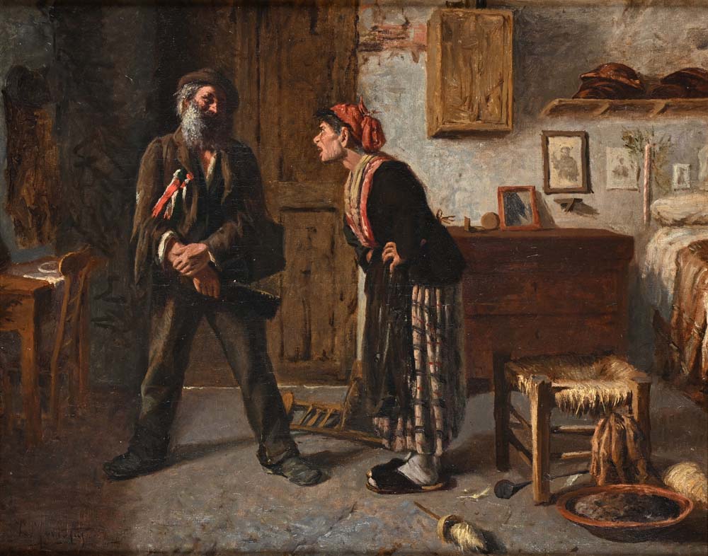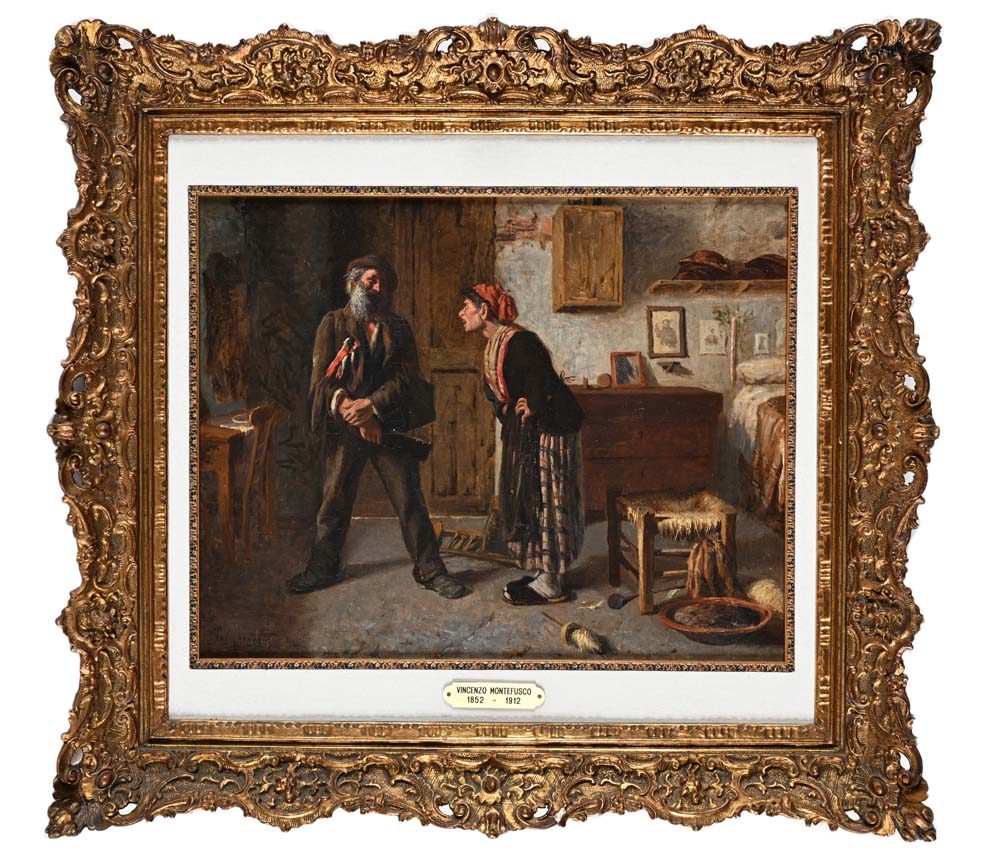 Vincenzo Montefusco Cava de' Tirreni 1852 - Roma 1912 Il rimprovero della moglie Firmato in basso a sinistra: 'V. Montefusco'. Olio su tela cm 38,5 x 48 - in cornice cm 59 x 65