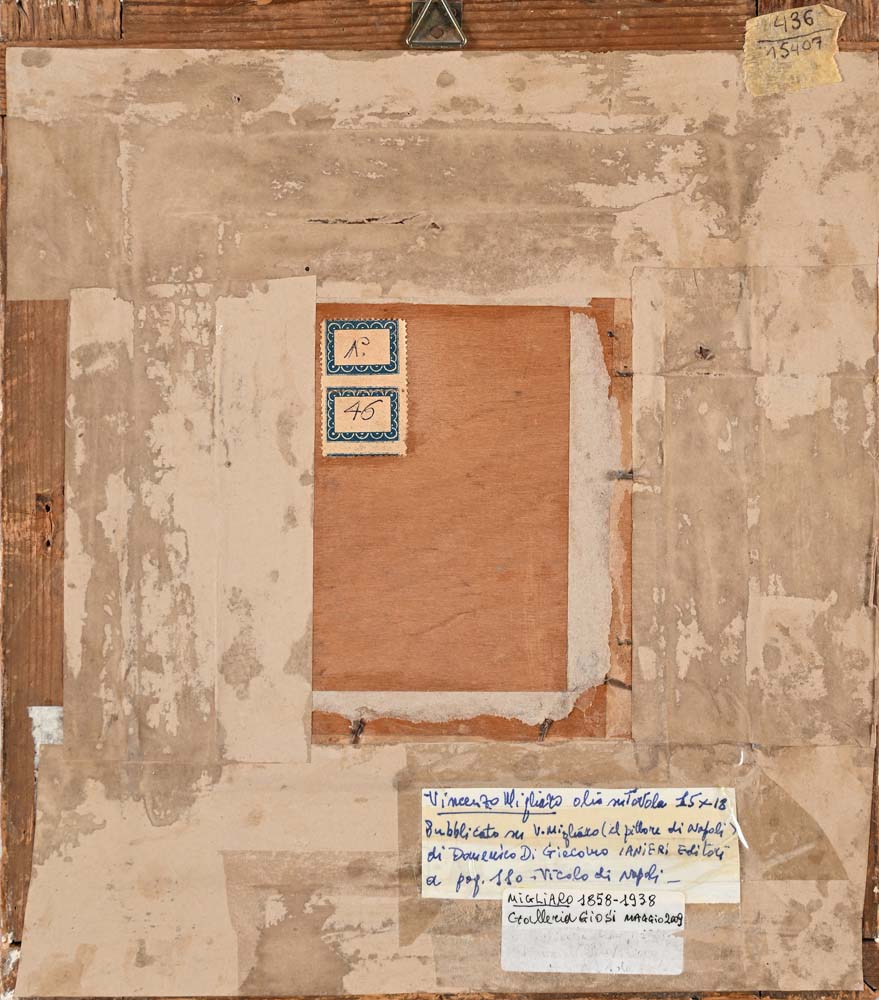 Sul retro due antichi cartellini con numeri di riferimento (46). olio su legno cm 18 x 14,5 - in cornice cm 33 x 28 Galleria Giosi, Napoli, maggio 2009.