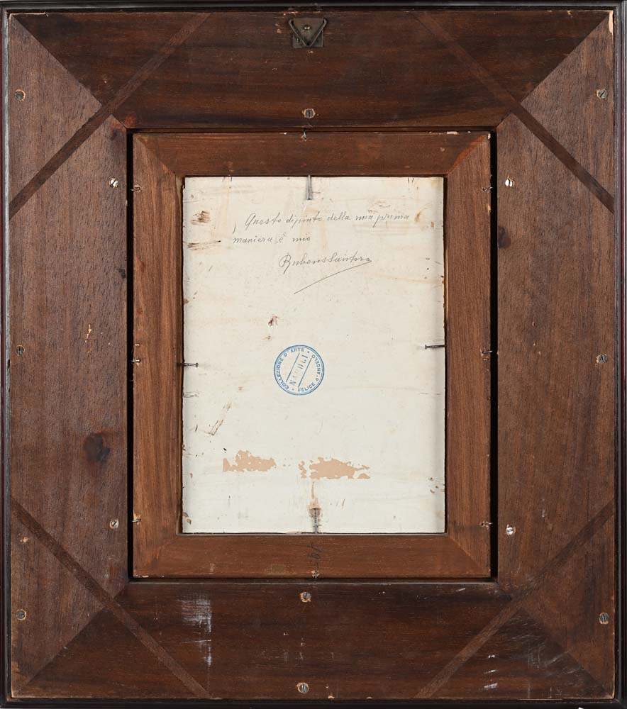 Sul retro: dichiarazione di autenticità e firma di mano dell'artista; timbro 'collezione d'arte Felice d'Angelo - Napoli'. Olio su cartone cm 24,5 x 18 - in cornice cm 48,5 x 43 Collezione d'arte Felice d'Angelo, Napoli;