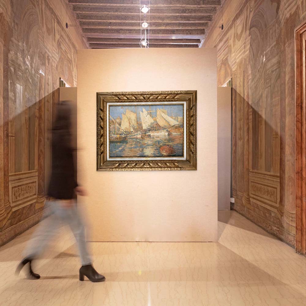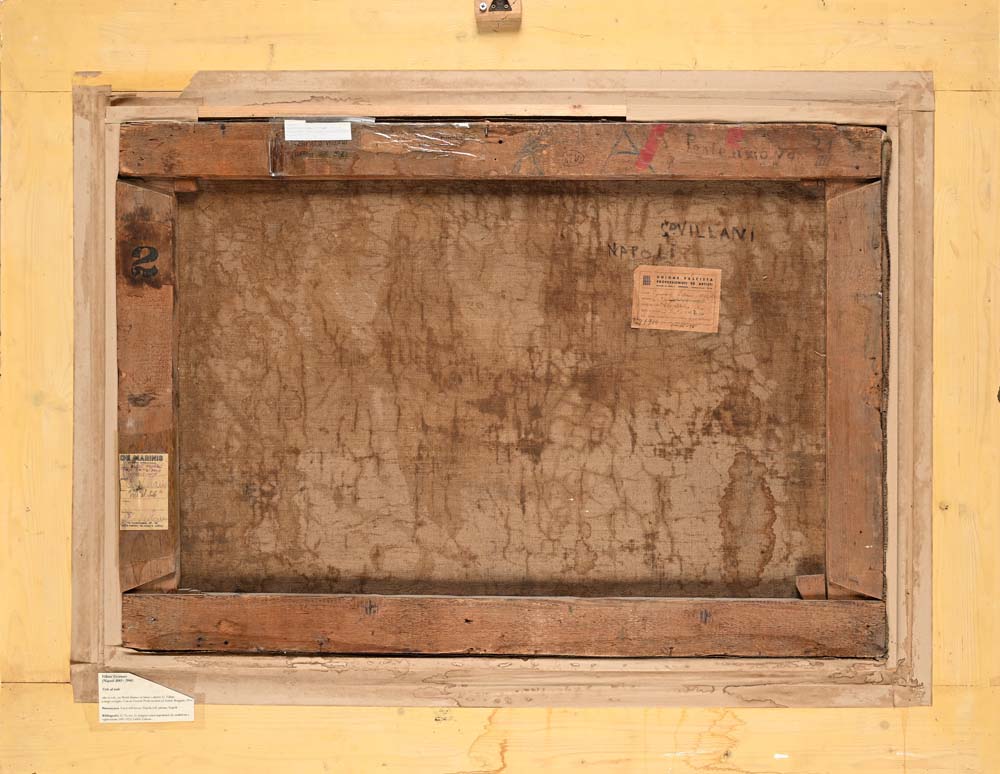 Sul retro, sulla tela: firma di mano dell’artista; cartellino a stampa dell’ ‘Unione Fascista Professionisti ed Artisti’ di Bergamo con scritto autore, indirizzo, titolo dell’opera, prezzo di vendita e anno di esecuzione (‘opera del 1914’). Sul telaio: antico cartellino consunto in lingua tedesca; antico cartellino con numero di riferimento (2). olio su tela cm 68 x 98 - in cornice cm 101 x 130 Eredi dell'artista, Napoli;