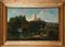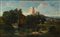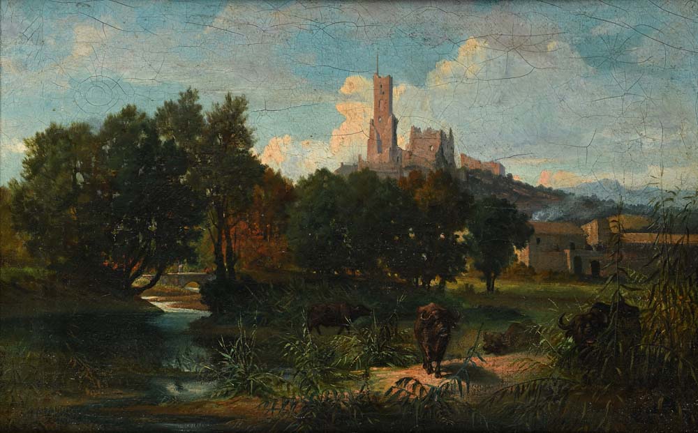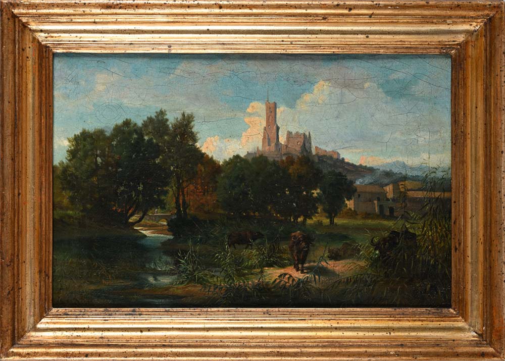 Scuola romana del XIX secolo Bufali nei pressi di un ruscello con un antico borgo in lontananza olio su tela cm 31 x 47 - in cornice cm 41,5 x 58