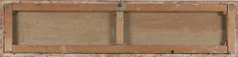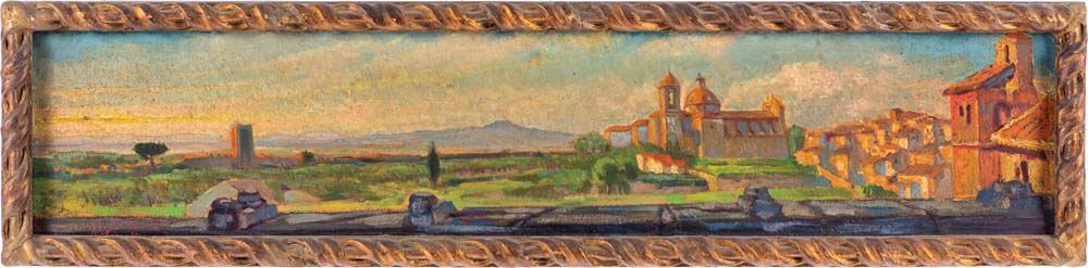Scuola romana fine del XIX inizi del XX secolo Veduta di Roma al tramonto Firmato in basso a sinistra. Olio su tela cm 21,5 x 99 - in cornice cm 25,5 x 103