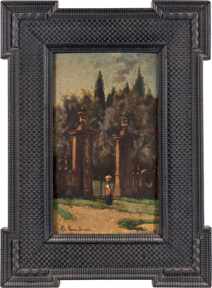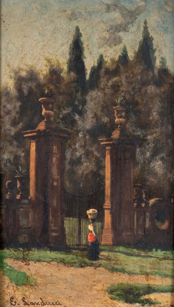 E. Landucci (Scuola romana seconda metà del XIX secolo) 'Cancello della Villa Aldobrandini a Frascati' 1893 Firmato in basso a sinistra: 'E. Landucci'.