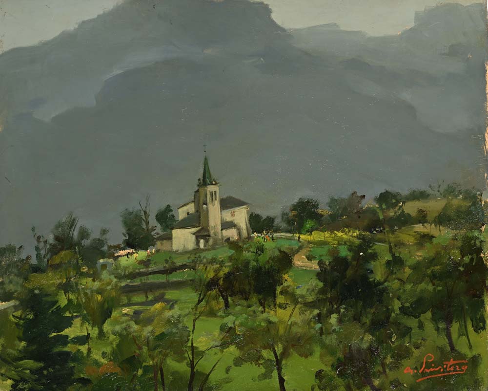 Antonio Privitera 1910 - 1989 Paesaggio collinare con chiesetta Firmato: 'A....
