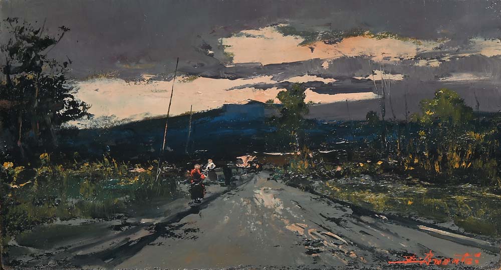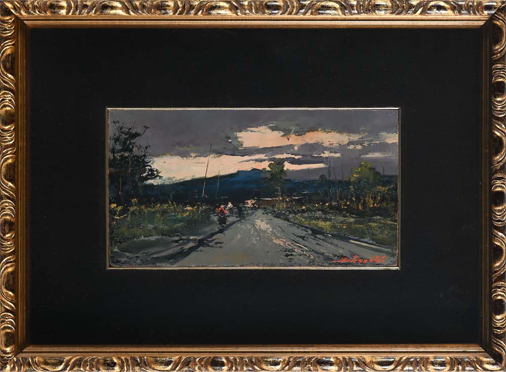 Ezelino Briante Napoli 1901 - Roma 1971 Ritorno dai campi Firmato in basso a destra: 'E. Briante'. olio su cartone pressato cm 13 x 24 - in cornice cm 30 x 42