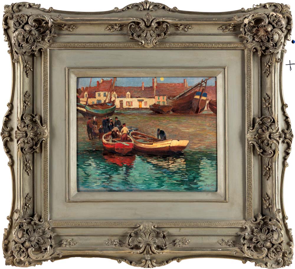 Corradetti (Scuola italiana inizi del XX secolo) Il ritorno dei pescatori Firmato in basso a destra: 'Corradetti'. Olio su tavola cm 34 x 45 - in cornice cm 75 x 81
