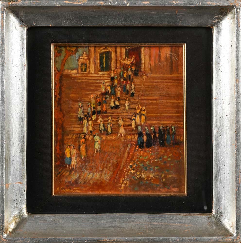 Antonio Cannata Polistena (RC) 1895 - Roma 1960 Donne in una processione che esce dalla chiesa Firmato: 'A Cannata' in basso a sinistra. olio su legno cm 20 x 18 - in cornice cm 30,5 x 30,5