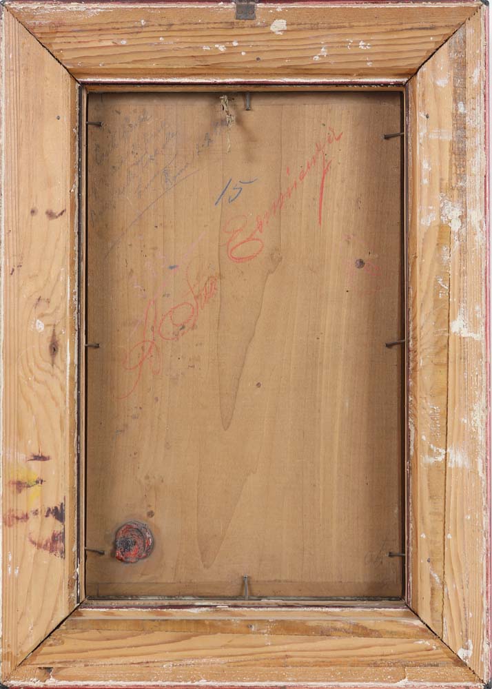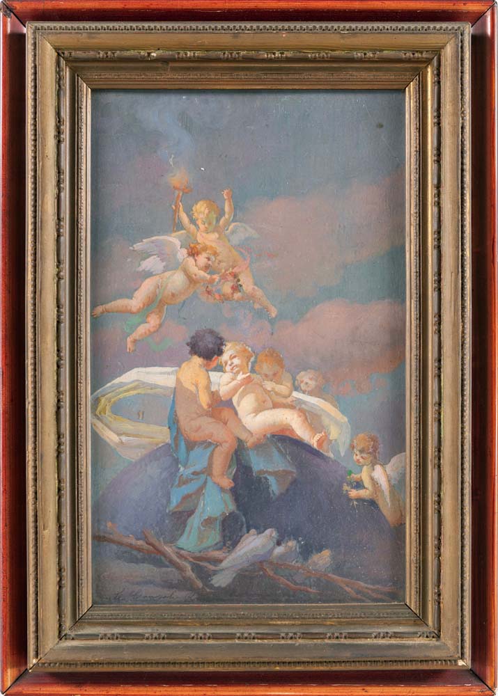 Sebastiano Conti Consoli Catania 1885 - Roma 1950 Putti Firmato in basso a sinistra: 'Conti Consoli Roma'. Olio su tavola cm 35,5 x 22 - con cornice cm 47 x 34