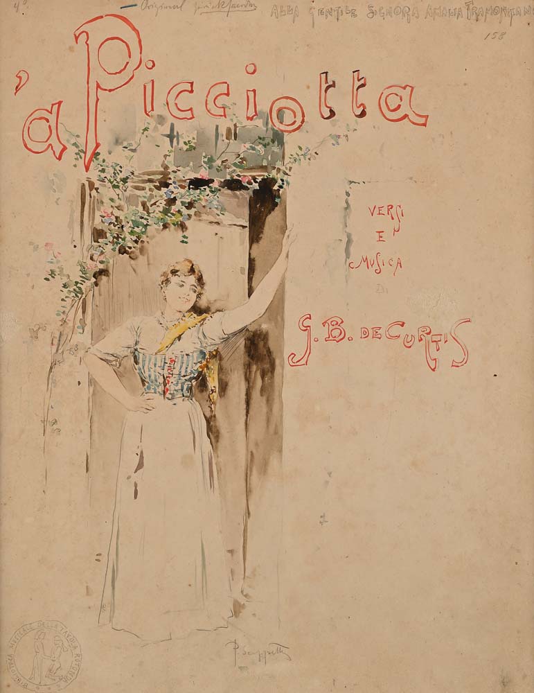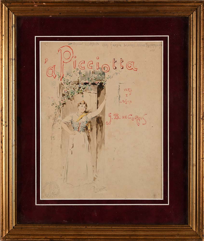Si tratta del bozzetto per l'omonima cartolina postale, comprendente anche lo spartito musicale di G.B. de Curtis. Matita e acquerello su cartoncino cm 30 x 24 - in cornice cm 46 x 40