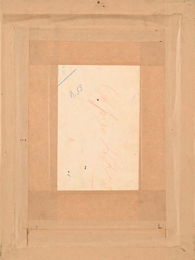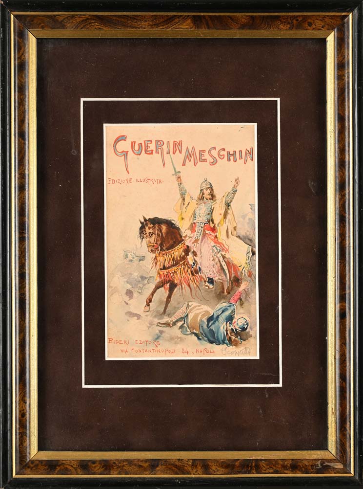 Si tratta di una tavola originale, eseguita per l'editore Bideri di Napoli, per una copertina del libro ‘Guerin Meschin’. Acquerello su cartoncino cm 17 x 11 - in cornice cm 36 x 27