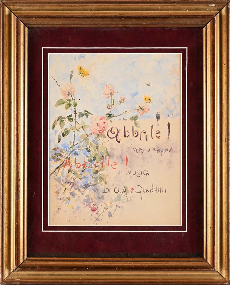 Pietro Scoppetta Amalfi 1863 - Napoli 1920 'Abbrile Abbrile !' Si tratta di un bozzetto per l'omonima cartolina postale, comprendente anche lo spartito musicale di A. Giannini. Acquerello su cartoncino cm 30,7 x 23,5 - in cornice cm 51,5 x 42