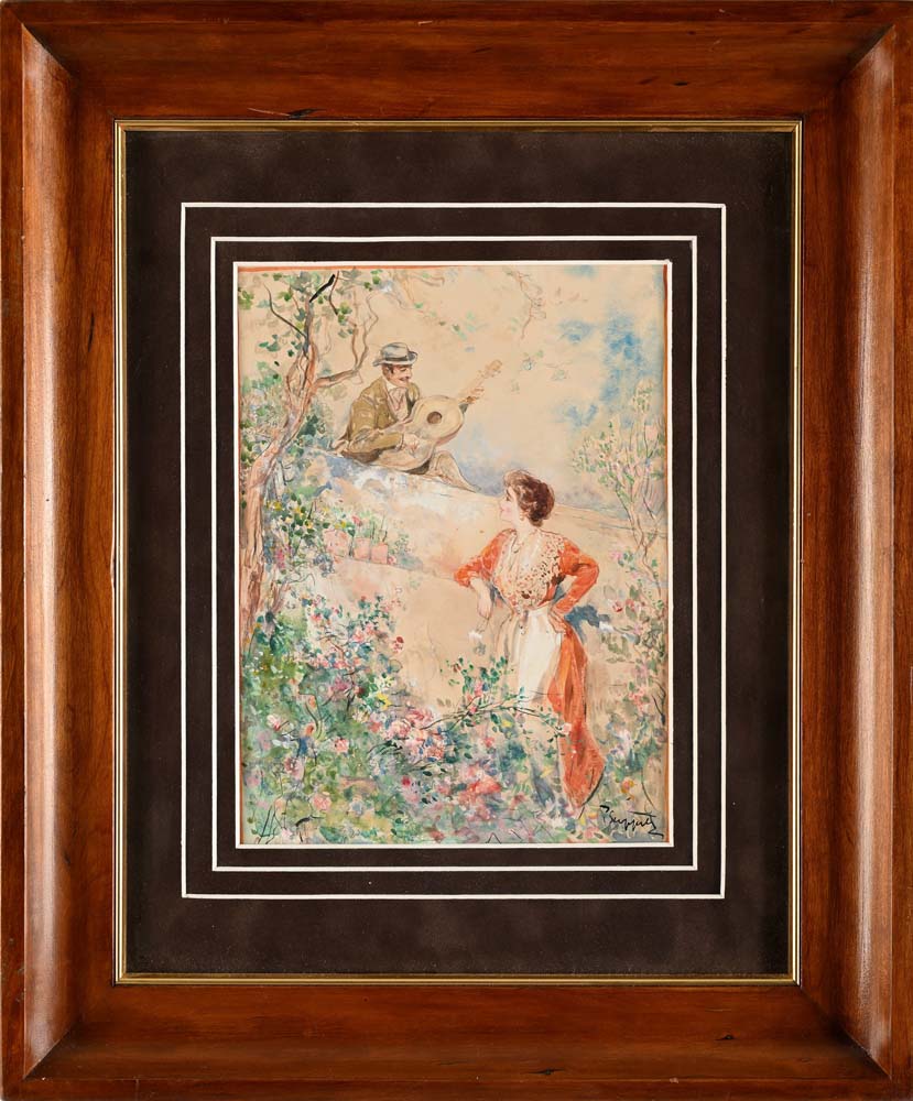 Si tratta del bozzetto per una cartolina postale contenente una canzone napoletana. tecnica mista su cartoncino cm 24,5 x 18 - in cornice cm 46 x 38