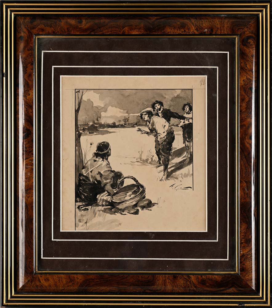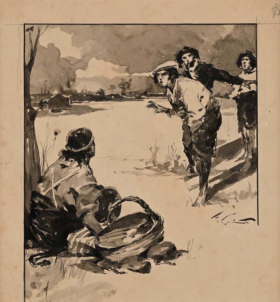 Si tratta di una tavola per la versione illustrata italiana de ‘I Racconti della Steppa’ di Massimo Gorki, edita dalla Tipografia Editrice F. Bideri di Napoli. Acquerello su cartoncino cm 17,5 x 21 - in cornice 40 x 45,5