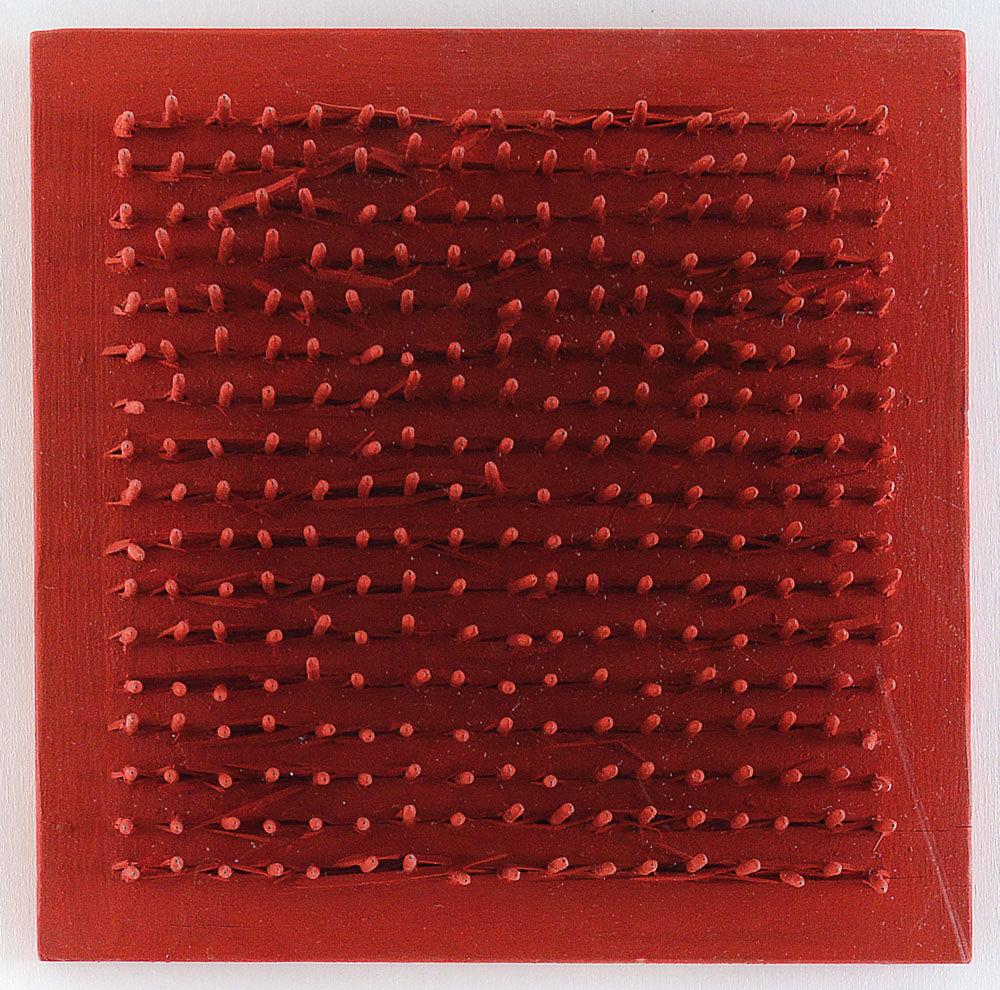 acrilici e chiodi su legno cm. 20x20, firma e anno al retro, dichiarazione d'autenticità dell'artista su foto, entro teca in plexiglass.