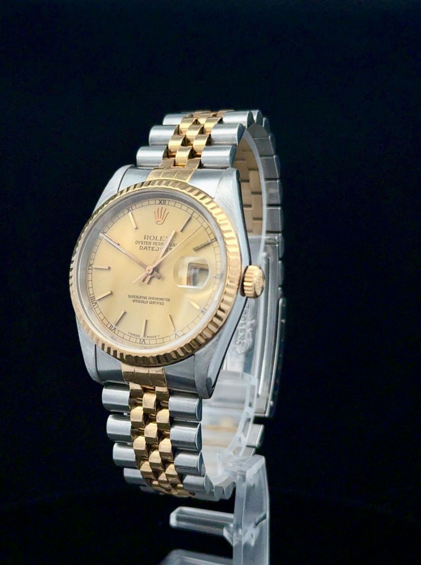 Marca Rolex Modello (Orologio) Datejust 36 Numero di referenza 16233 Carica Automatico Materiale della cassa Oro/Acciaio Materiale cinturino Oro/acciaio Anno 1994 Condizione Usato (Ottimo) L'articolo presenta segni di usura lievi, come ad esempio graffi leggeri, ma non percepibili al tatto. Corredo Con documenti originali, no box la scatola utilizzata solo per fotografie non in vendita Diametro 36 mm Impermeabile 10 ATM Materiale lunetta Oro giallo Vetro Vetro zaffiro Cinturino Materiale cinturino Oro/acciaio Colore cinturino Oro/acciaio Chiusura Déployante Materiale chiusura Acciaio Funzioni Data