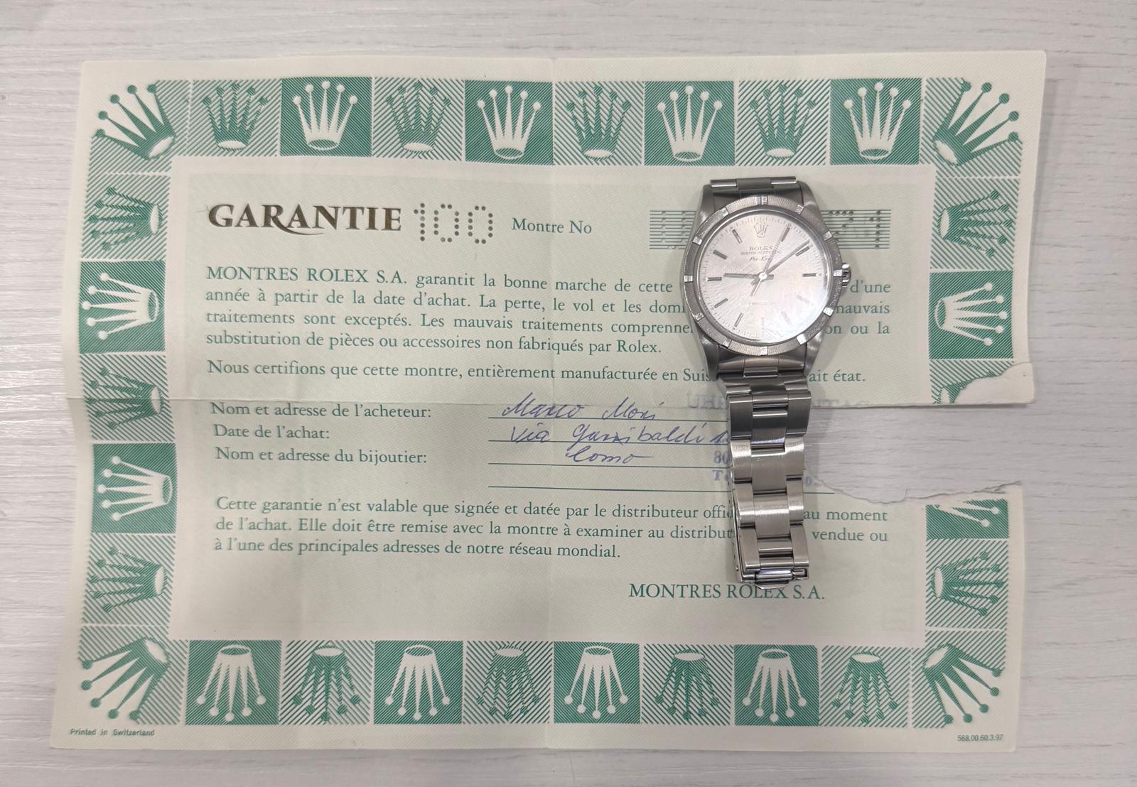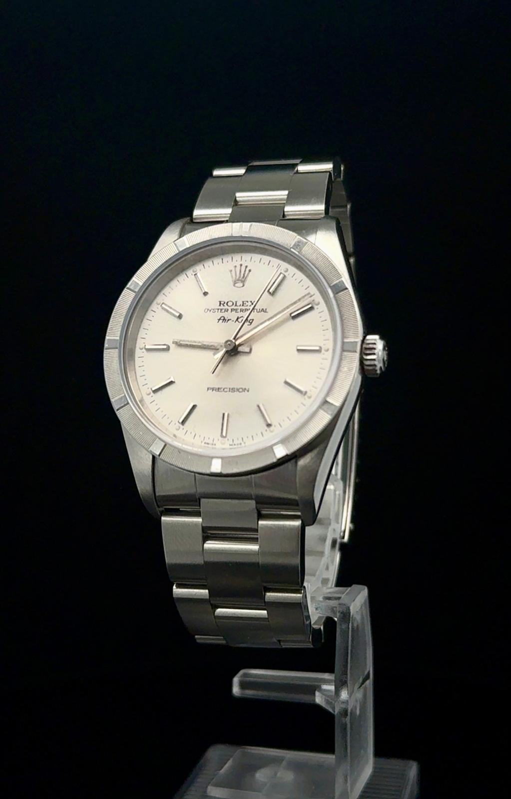 Marca Rolex Modello (Orologio) Air King Numero di referenza 14010 Carica Automatico Materiale della cassa Acciaio Materiale cinturino Acciaio Anno di produzione 1997 Condizione Ottimo (di seconda mano, segni di usura assenti o appena visibili) Corredo documenti originali, no box Cassa Materiale della cassa Acciaio Diametro 34 mm Impermeabile 10 ATM Materiale lunetta Acciaio Vetro Vetro zaffiro Quadrante Argento Numeri sul quadrante Senza numeri Cinturino Materiale cinturino Acciaio Colore cinturino Acciaio Chiusura Déployante Materiale chiusura Acciaio