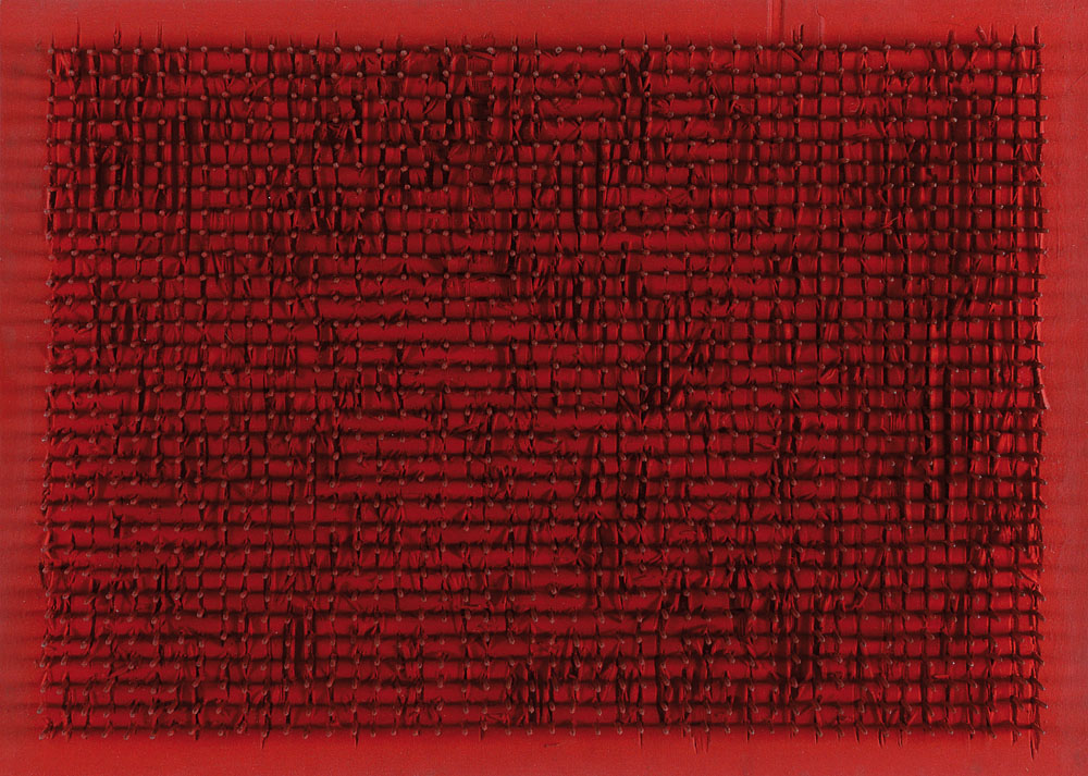 acrilico e chiodi su tavola cm. 35x50, firma e anno al retro, dichiarazione d'autenticità dell'artista su foto.