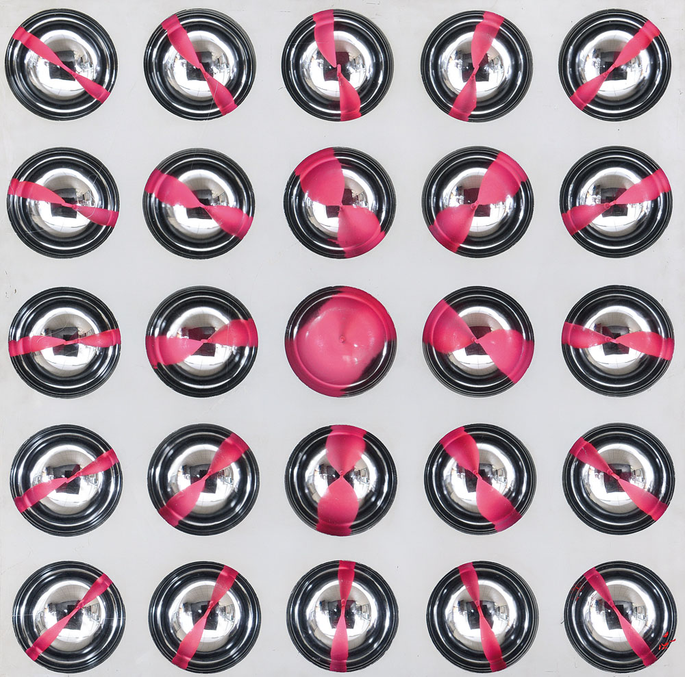 assemblaggio di materie plastiche (25 semisfere) cm. 87,5x87,5x9, firma incisa sul bordo destro, dichiarazione d'autenticità dell'artista su foto.