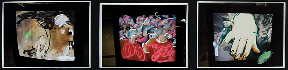 lotto di 3 tecniche miste su fotografia cm. 12x17 cadauna, entro unica cornice cm. tot. 21,5x63,5; tutte recano la firma dell'artista e due recano il timbro della Galleria Mazzoli (MO) al retro.