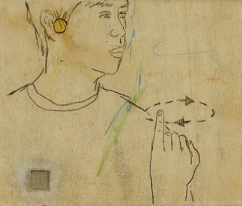 tecnica mista e lacca su tavola cm. 18x21, firma, titolo, anno e timbri dell'artista al retro, dichiarazione d'autenticità dell'artista su foto.