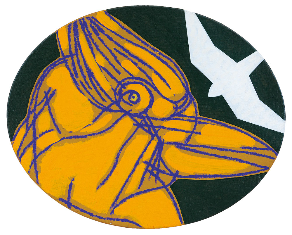 olio, acrilico e smalto su tela ovale cm. 40x50, firma, anno e titolo al retro, opera registrata presso l'Archivio Concetto Pozzati come da dichiarazione su foto.