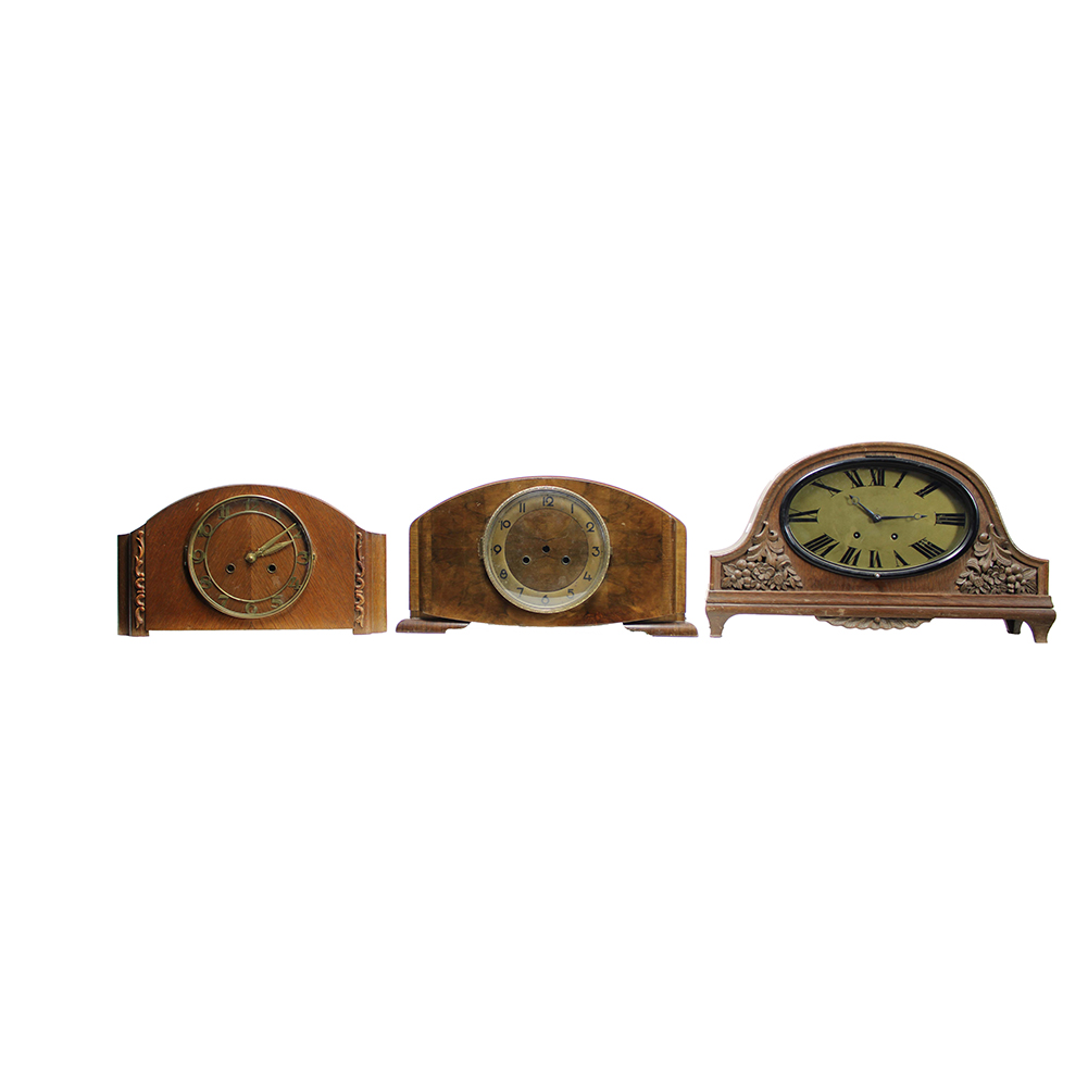 LOTTO COMPOSTO DA 1 orologio da tavolo in legno di castagno scolpito e 2 casse di orologio di cui uno in noce e un in rovere, mancanti di macchine , da revisionare , un pendolo mancante. H cm 28 x 47 x 13 / h cm 23 x 43 x 17 / h cm 22 x 38 x 15