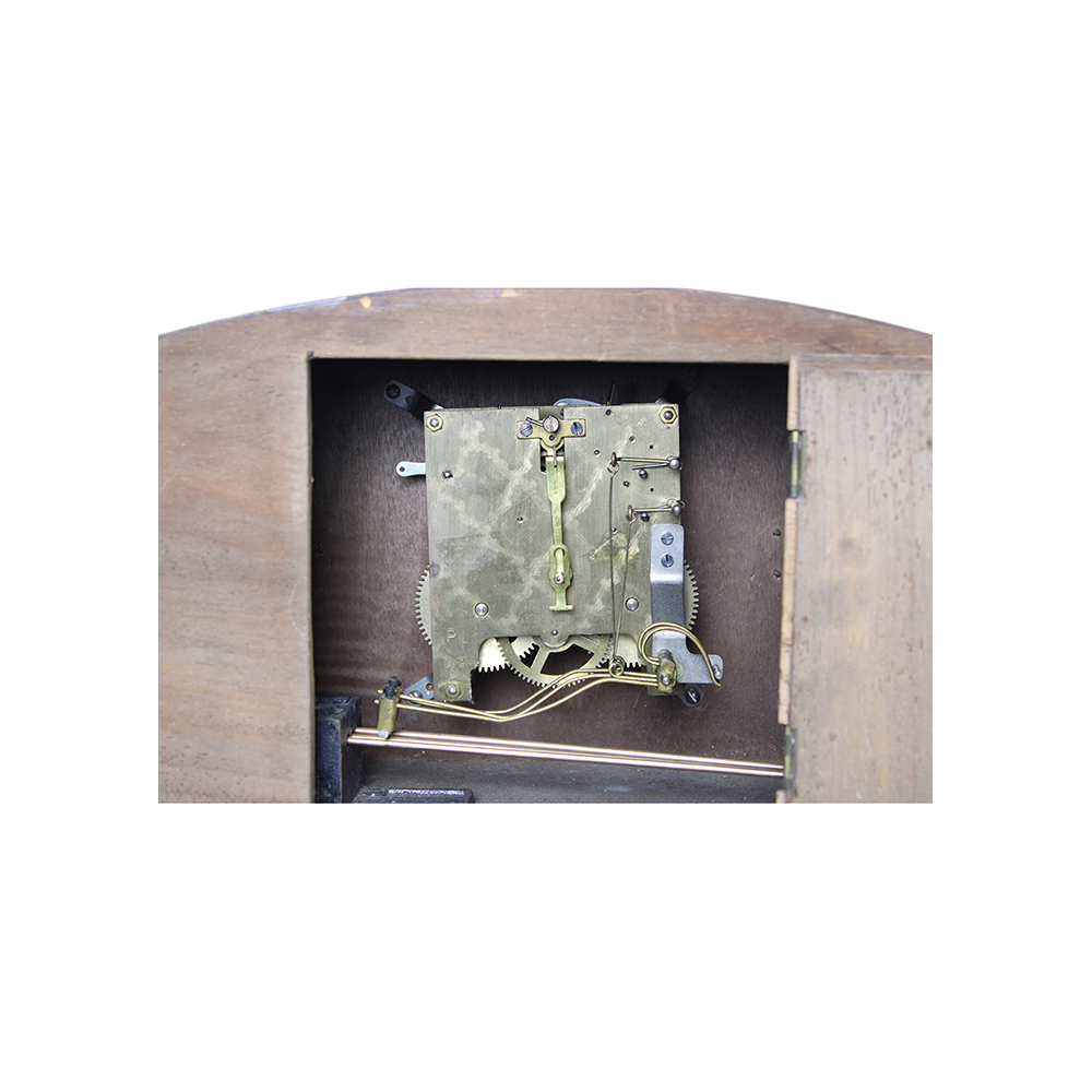 OROLOGIO DA TAVOLO con cassa in legno di noce , da revisionare, un pendolo mancante. Europa del Nord XX secolo h cm 24 x 53 x 18