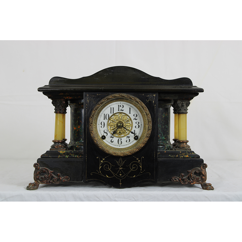 OROLOGIO DA CAMINO A TEMPIETTO in legno ebanizzato e dipinto a finto marmo e applicazioni in metallo reca sul retro scritta MADE USA , da revisionare Primi 900 h cm 30 x 46 x 18