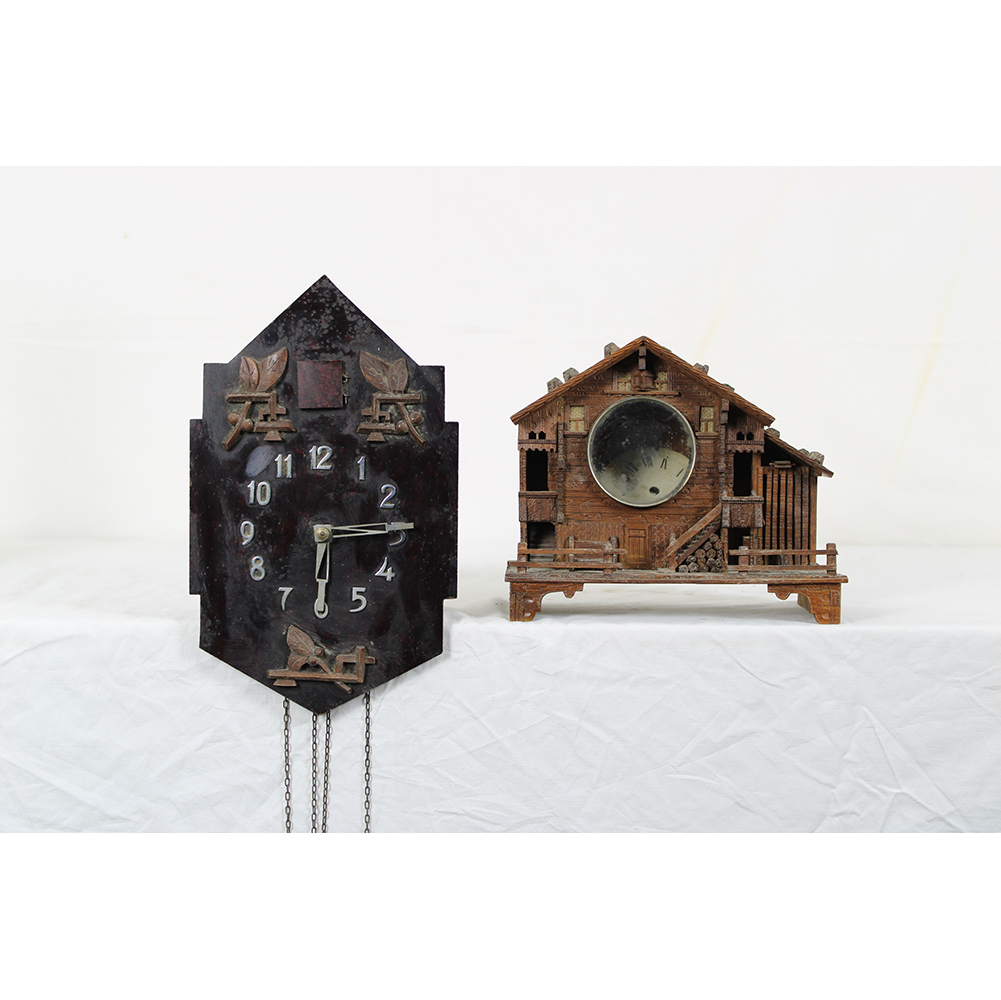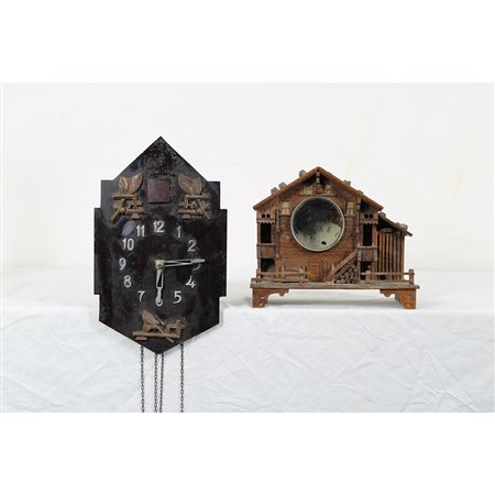 LOTTO COMPOSTO DA 1 orologio a cucù in legno e 1 cassa di orologio dalla caratterista forma a casetta svizzera in legno a carillon mancante di macchina , da revisionare Svizzera XX secolo h cm 30 x 18 x 12 / h cm 20 x 24 x 13