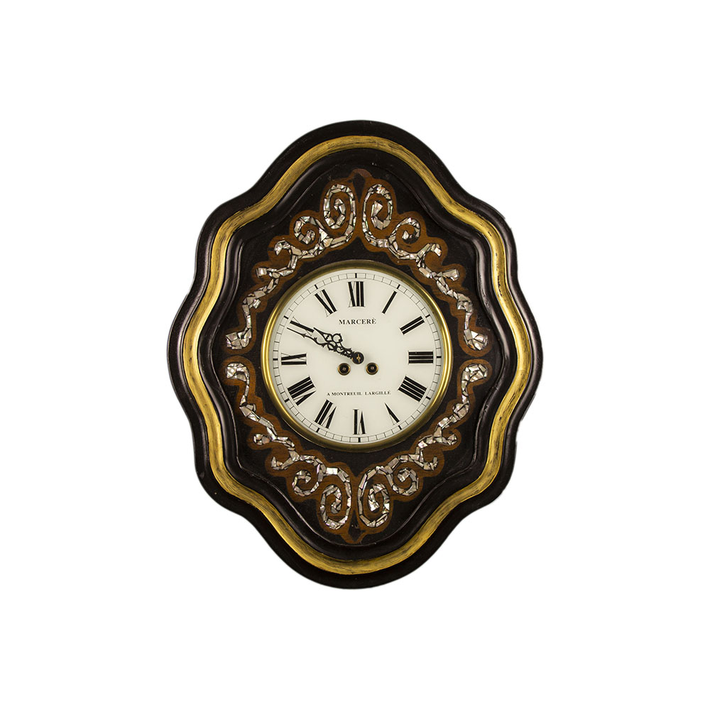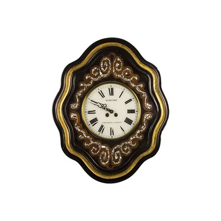 OROLOGIO DA MURO detto occhio di bue in legno ebanizzato, dorato ed incrostazioni in madreperla, quadrante con numeri romani , da revisionare Francia XIX secolo h cm 61 x 49