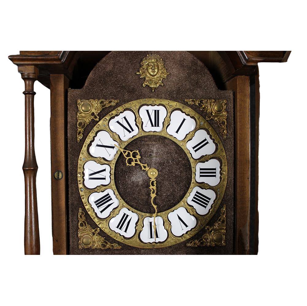 OROLOGIO A TORRE in legno di noce di gusto settecentesco con quadrante in bronzo e smalto firmato Kienzle con suoneria quarte mezze e ore , da revisionare Germania XX secolo h cm 202 x 40 x 24