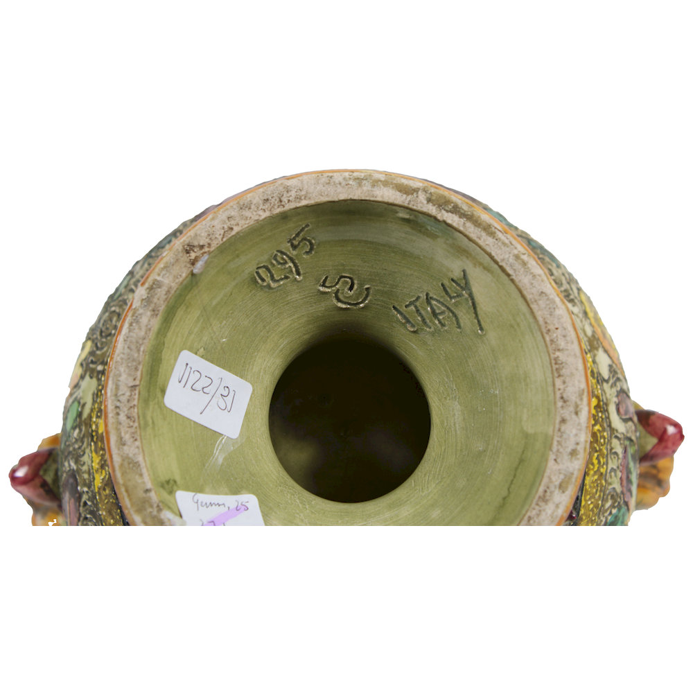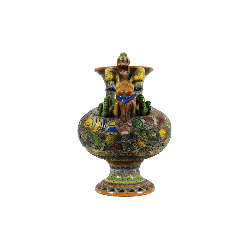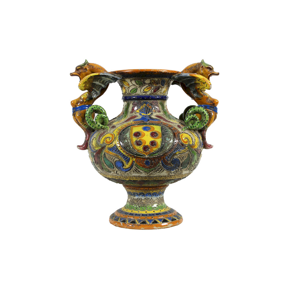 VASO in maiolica policroma decorata a motivi floreali con manici a forma di draghi, sbeccate maestranze italiane primi 900 h cm 27 x 27 x 23