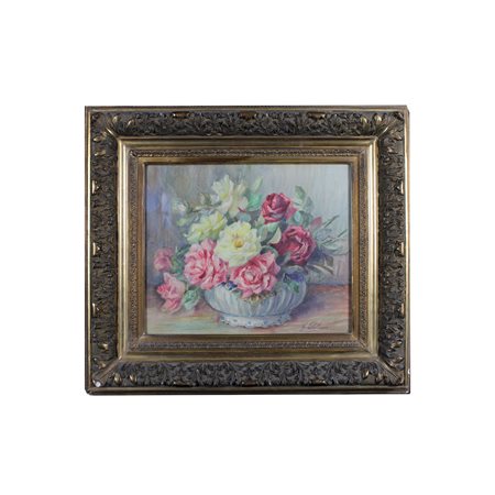 DIPINTO SU TESSUTO raffigurante vaso con fiori a firma G. Pellerier dentro bella cornice in legno e pastiglia dorata ad oro zecchino Francia XIX secolo h cm 36 x 45 / h cm 64 x 71