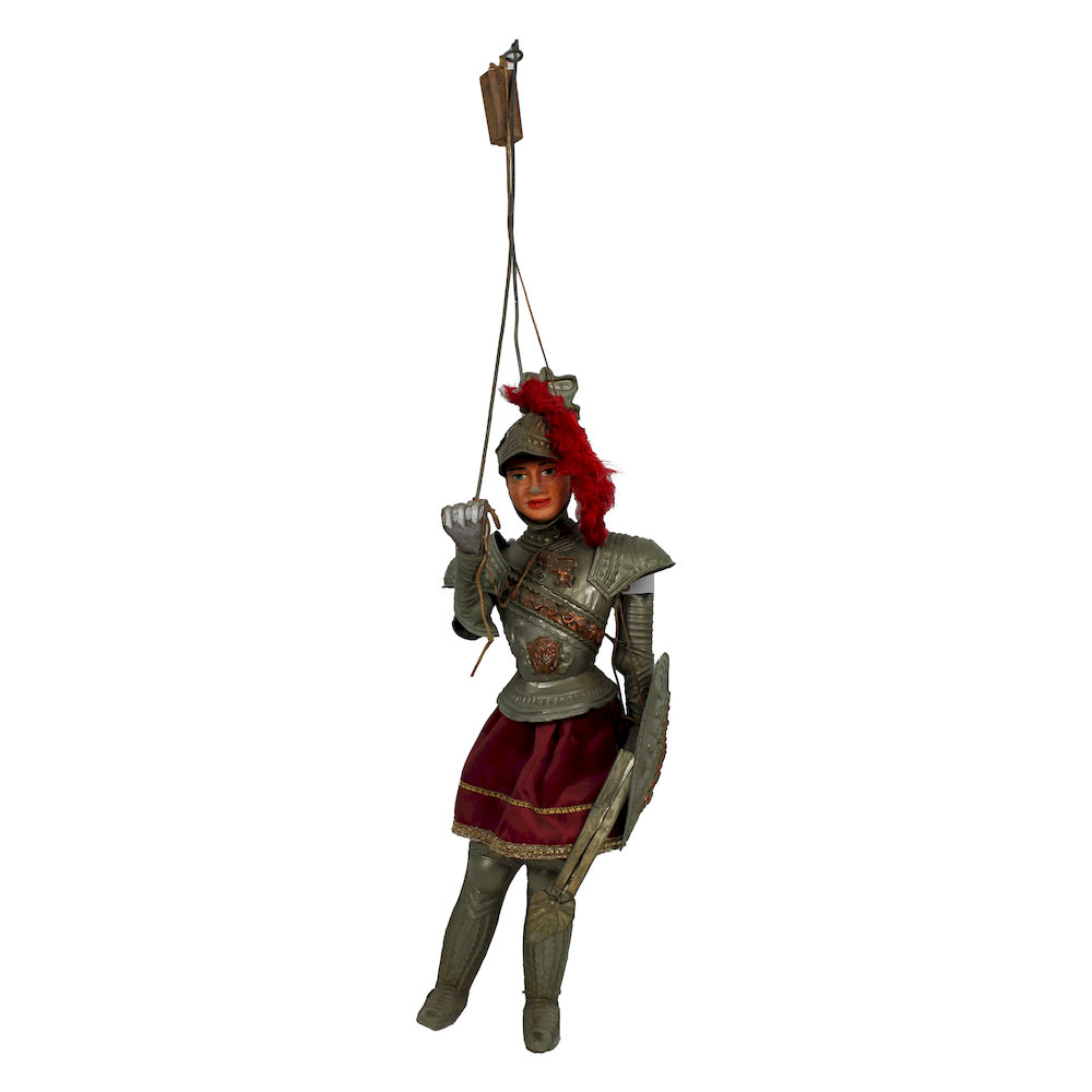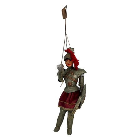 PUPO SICILIANO raffigurante Orlando testa ed arti in legno armatura in metallo e abiti in tessuto Sicilia XX secolo h cm 95 con gancio