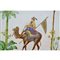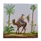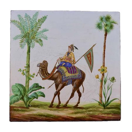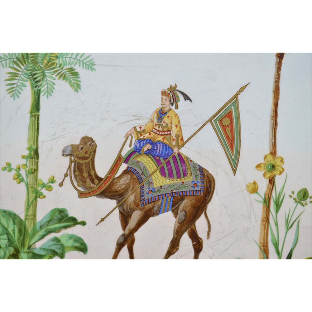 PLACCA in porcellana dipinta, lumeggiature in oro zecchino raffigurante scena di vita orientale con dromedario e personaggio firmata montereau Im&c.ie creil Francia XIX secolo h cm 20 x 20