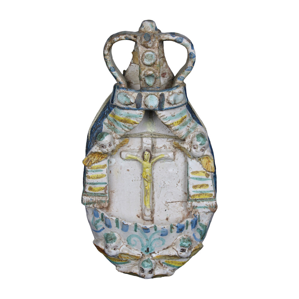 ACQUASANTIERA in maiolica policroma raffigurante Crocifisso e angeli, vecchi incollaggi alla corona manifattura popolare sud Italia XIX secolo h cm 33 x 17 x 6