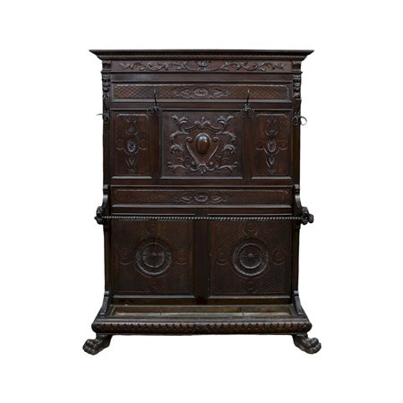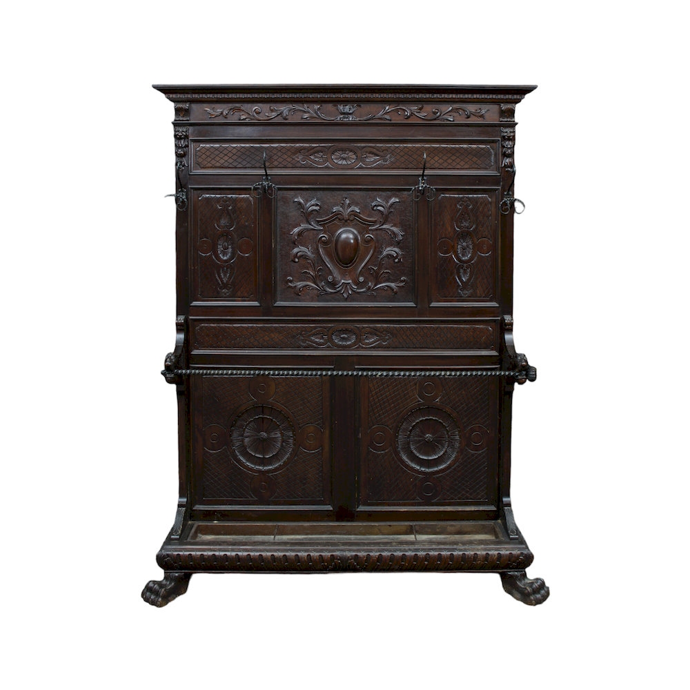 ATTACCAPANNI CON BASTONIERA in legno di noce riccamente scolpito di gusto rinascimentale Sicilia fine 800 h cm 202 x 155 x 35