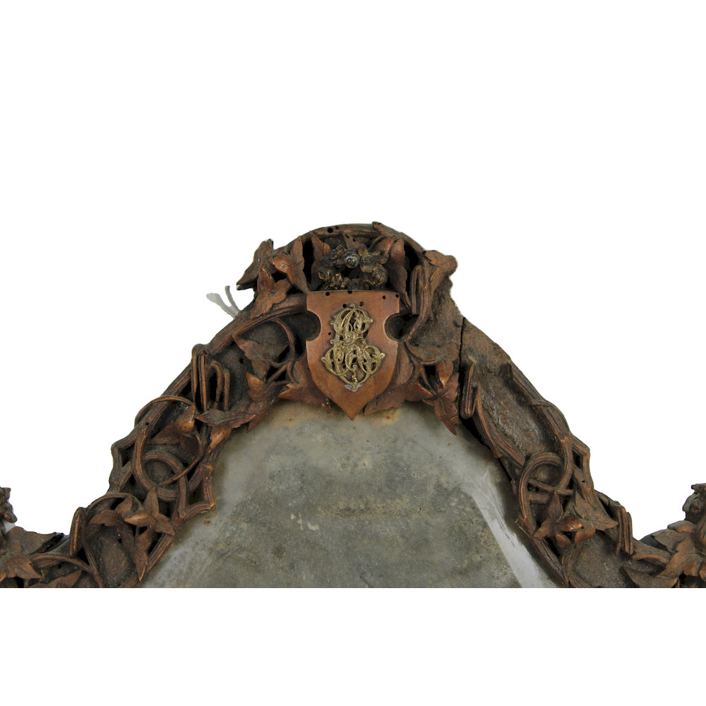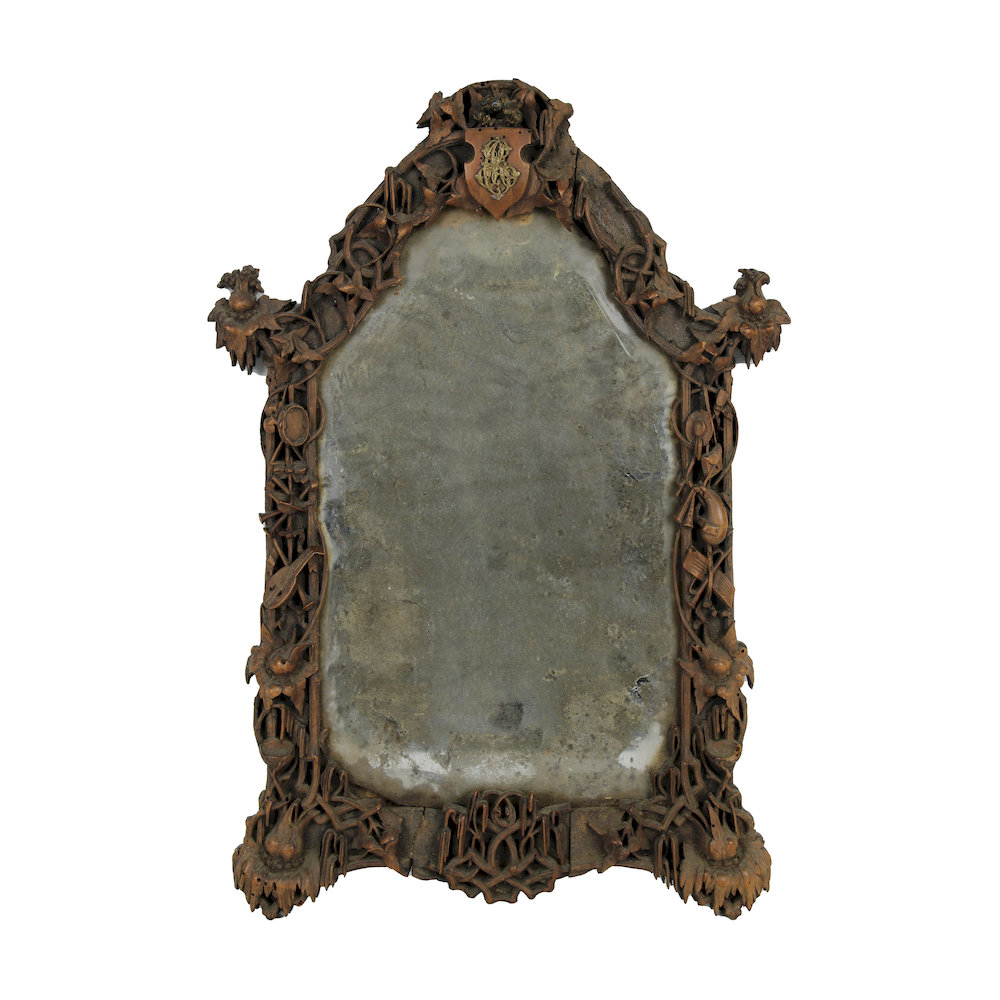 IMPORTANTE PICCOLA SPECCHIERA in legno a motivi vegetali e trofei manifattura Foresta Nera XVIII secolo h cm 45 x 31 x 4