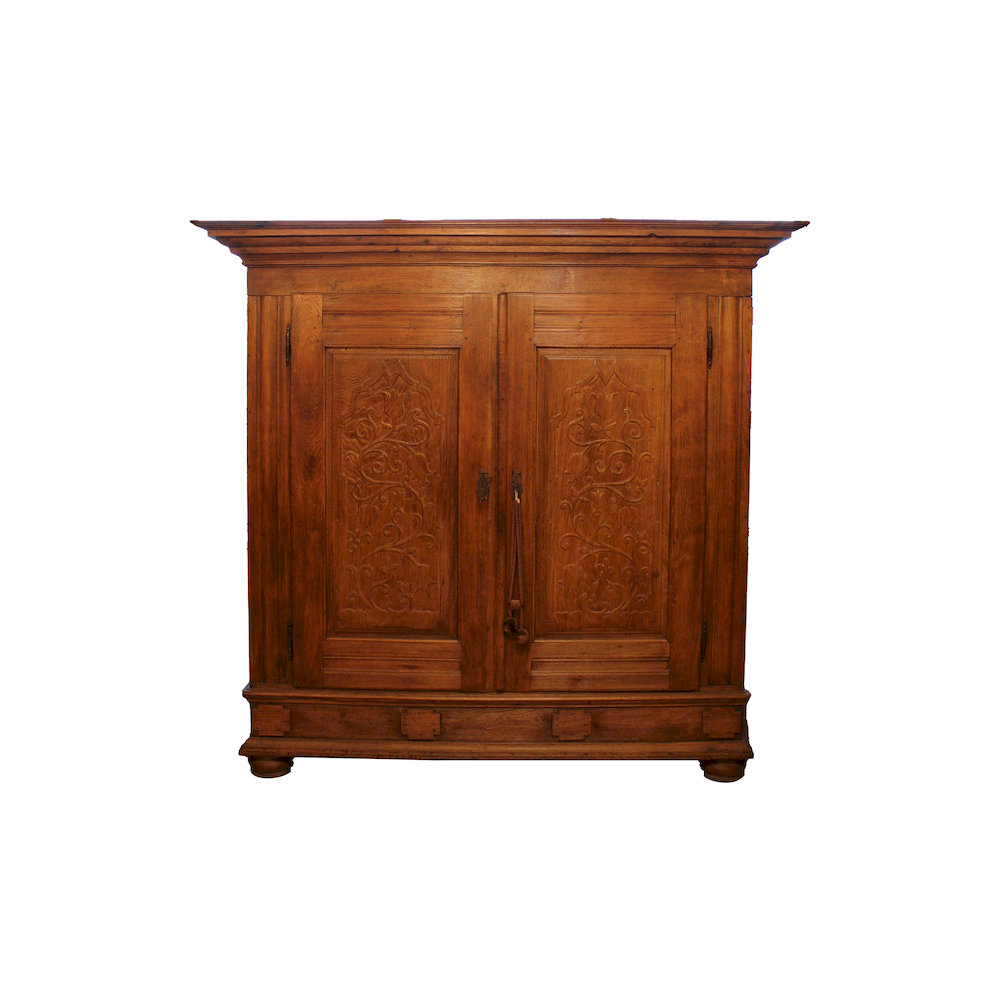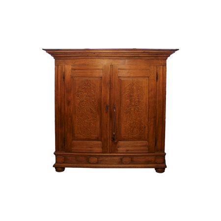 GRANDE ARMADIO in legno di castagno a 2 ante scolpite a motivi floreali Europa del Nord XVIII/XIX secolo h cm 194 x 200 x 74