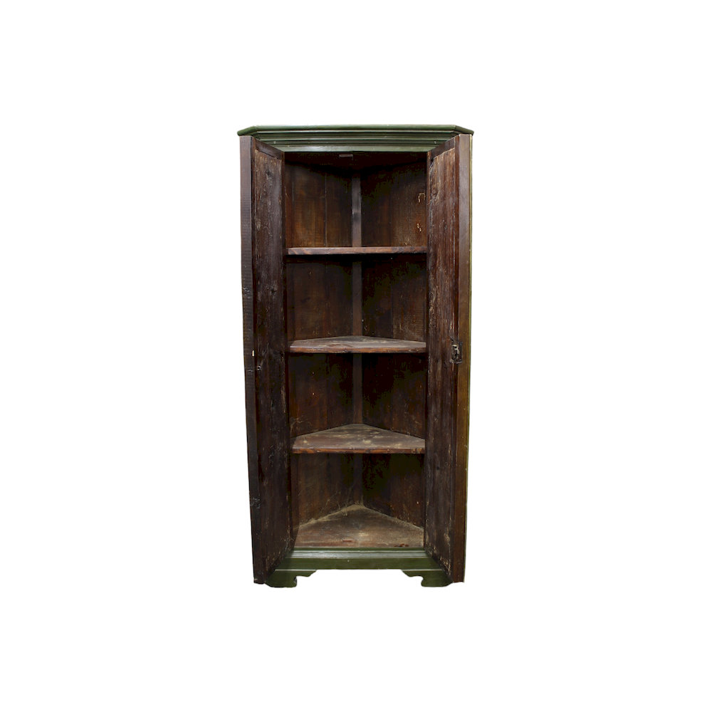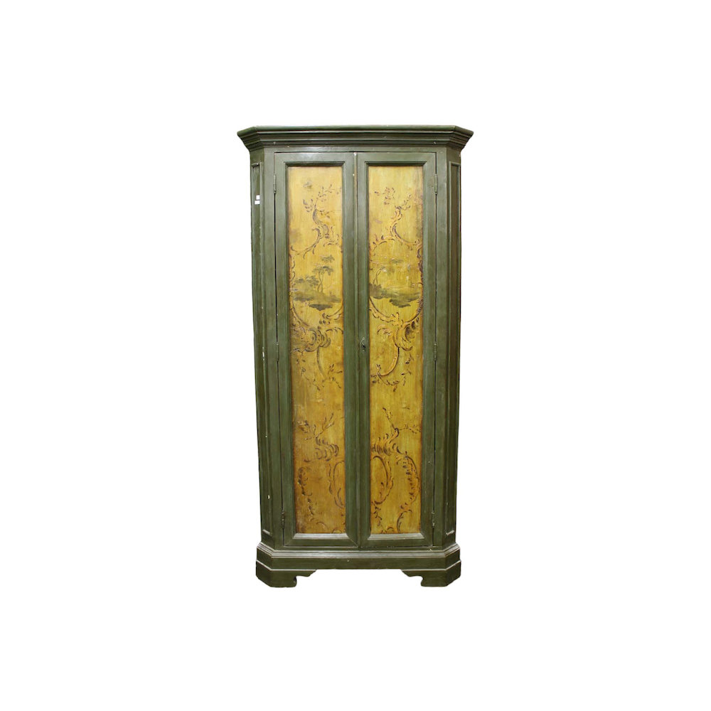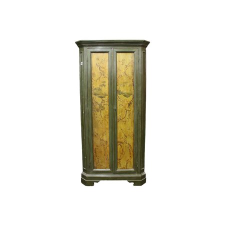MOBILE CANTONALE AD ANGOLO A 2 ANTE in legno laccato a fondo verde e dipinto a cartigli dentro riserve paesaggi , usure del tempo e vecchi restauri maestranze siciliane XVIII secolo h cm 206 x 103 x 65