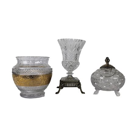 LOTTO COMPOSTO DA 1 vaso, 1 porta bonbon ed 1 centrotavola in cristallo intagliato XX secolo h cm 29 / h cm 22 / h cm 20