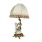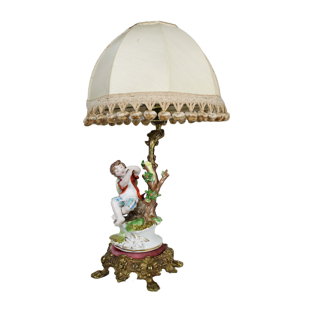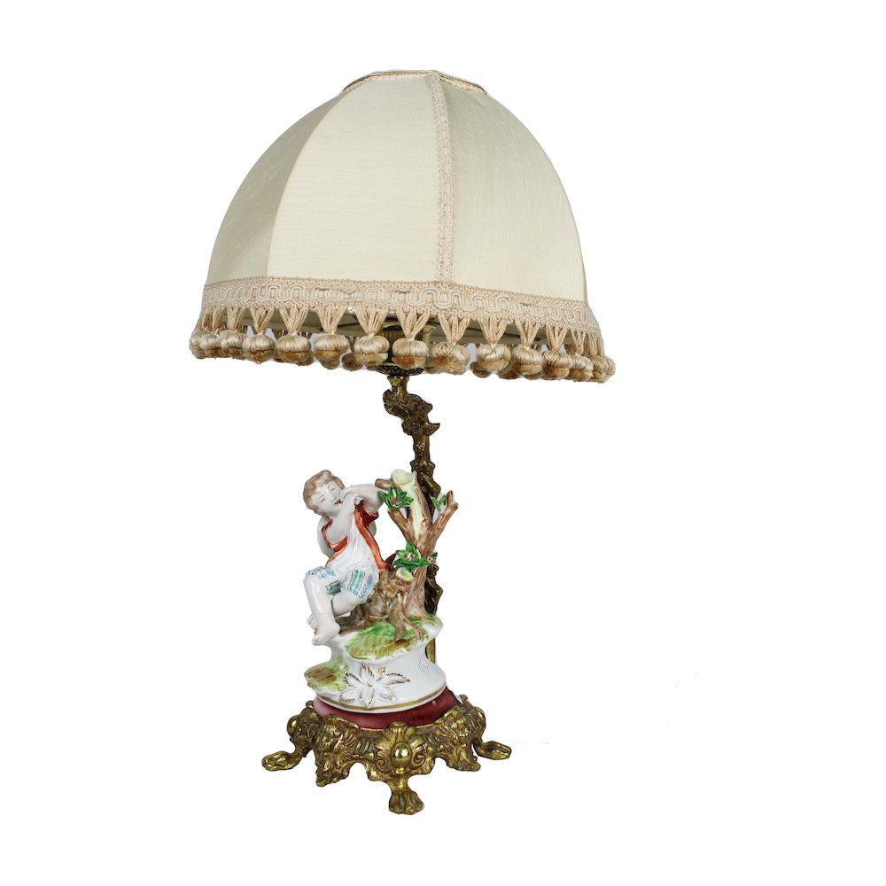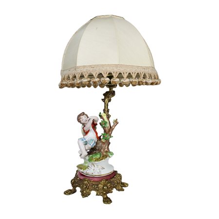COPPIA LUMI in porcellana policroma e bronzo dorato raffigurante allegoria della musica con paralumi in stoffa manifattura Napoli XX secolo h cm 51,5 x 31