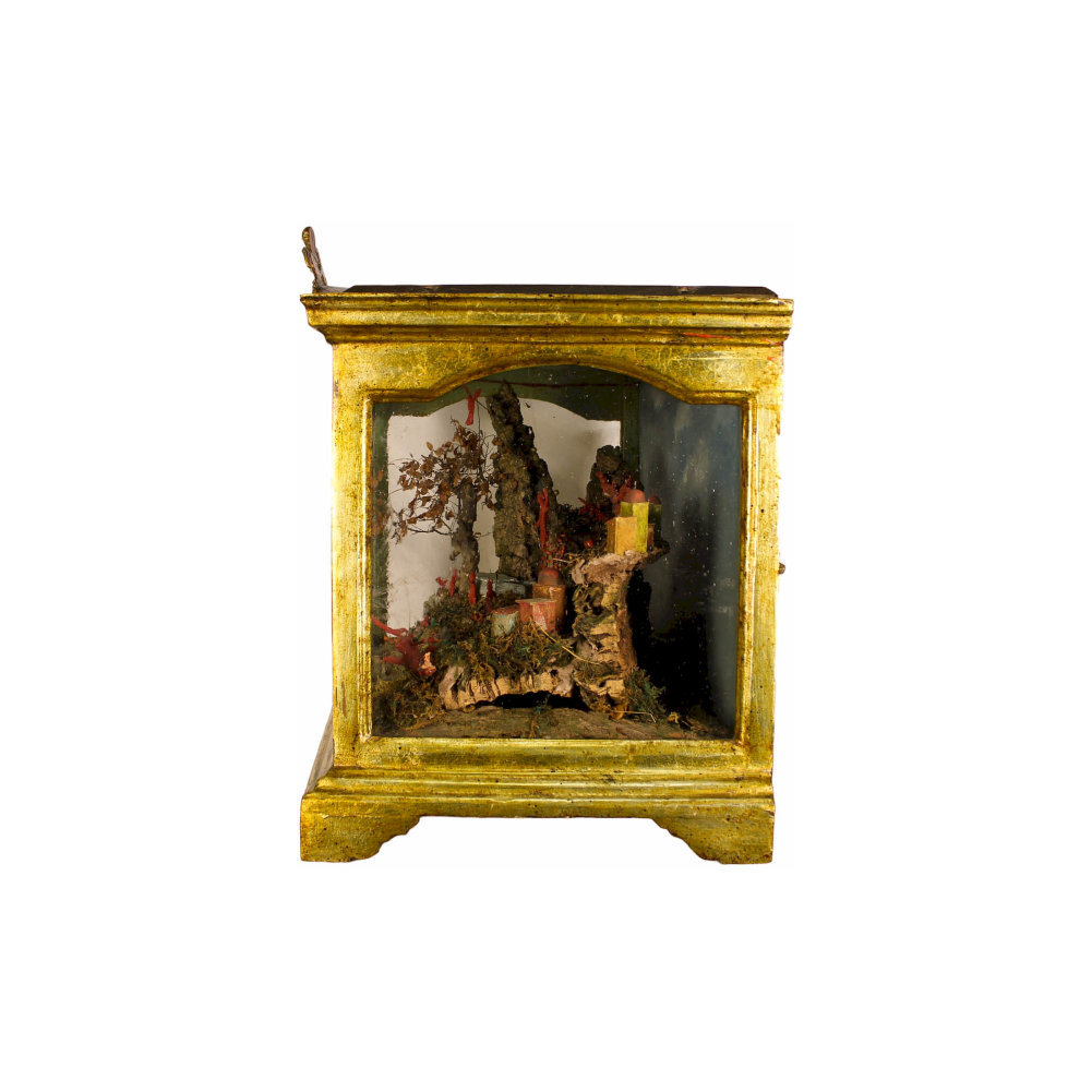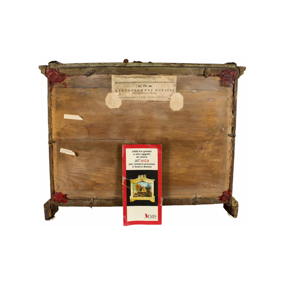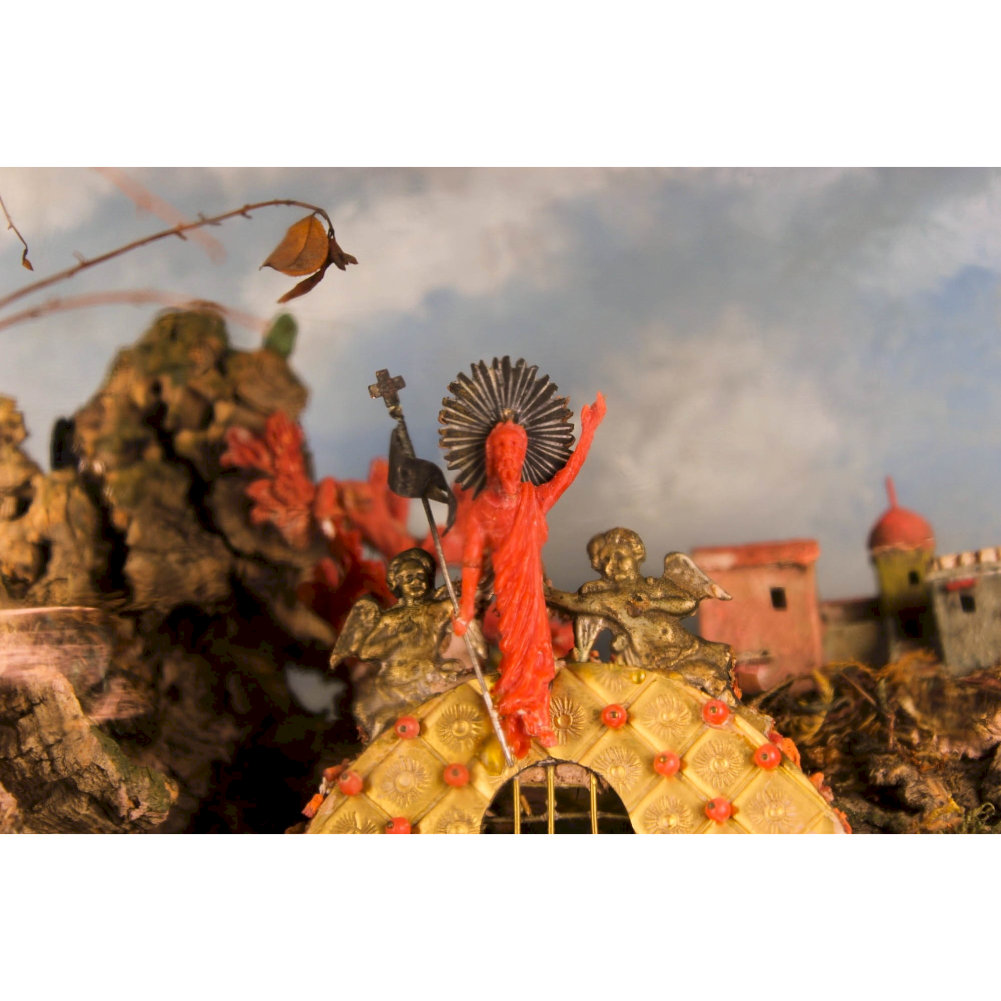 IMPORTANTE COMPOSIZIONE in corallo raffigurante la resurrezione di Cristo dentro elegante teca in legno dorato ad argento e mecca e dipinto reca sul retro cartiglio di provenienza Bartholomeus Corsini già collezione banco di sicilia e presente nell'asta "1000 fra gioielli e altri oggetti di valore all'asta per rendere prezioso il vostro natale" allegato deplian maestranze Trapanesi prima metà del XVIII secolo h cm 50 x 54 x 36
