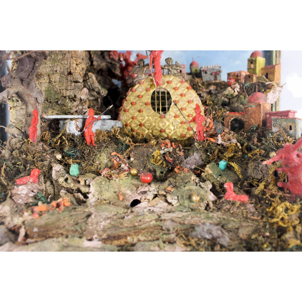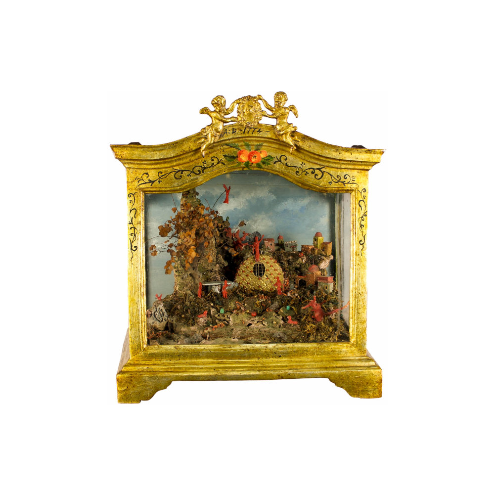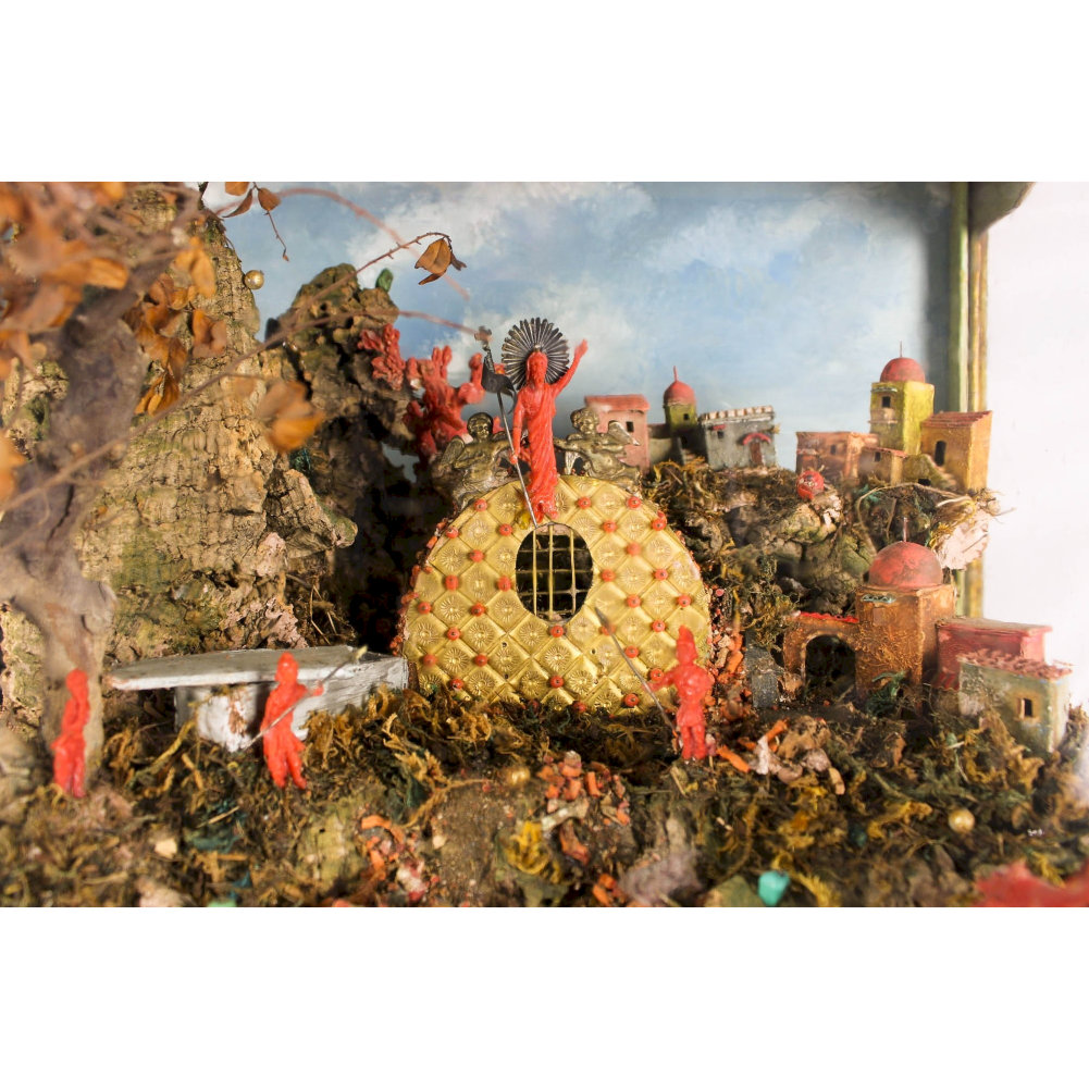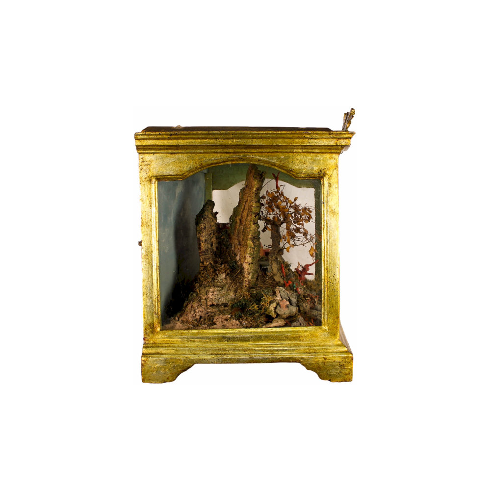 IMPORTANTE COMPOSIZIONE in corallo raffigurante la resurrezione di Cristo dentro elegante teca in legno dorato ad argento e mecca e dipinto reca sul retro cartiglio di provenienza Bartholomeus Corsini già collezione banco di sicilia e presente nell'asta "1000 fra gioielli e altri oggetti di valore all'asta per rendere prezioso il vostro natale" allegato deplian maestranze Trapanesi prima metà del XVIII secolo h cm 50 x 54 x 36