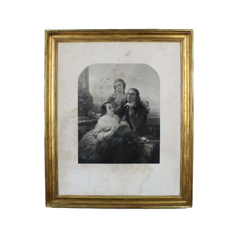 STAMPA raffigurante scena d'interno con personaggi dentro cornice in legno dorato Inghilterra primi 900 h cm 106 x 89