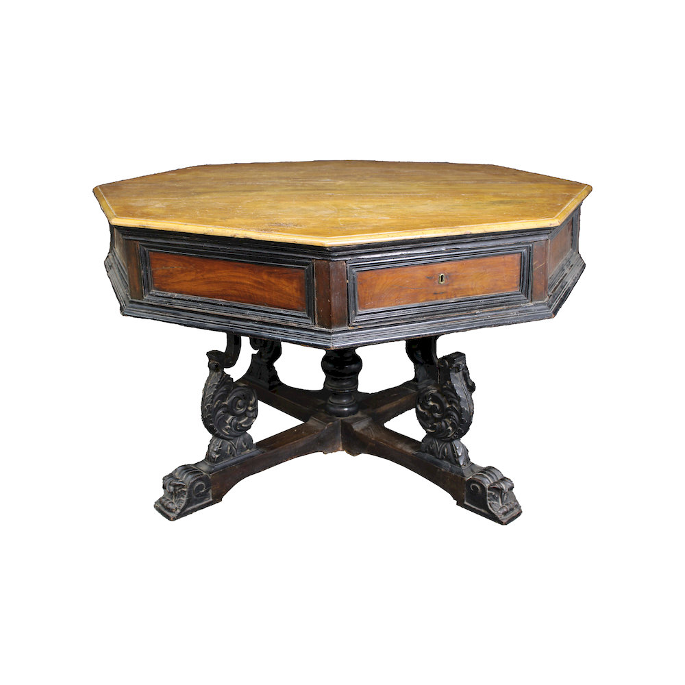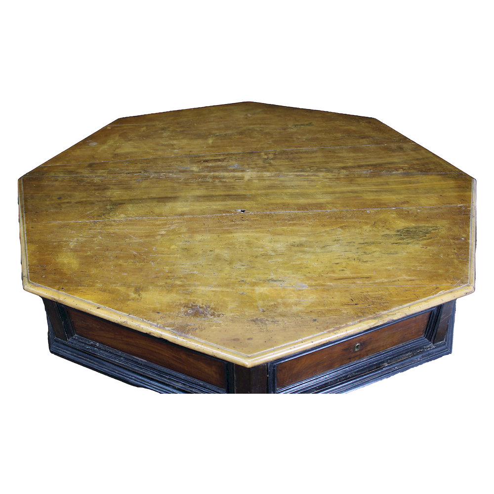 IMPORTANTE TAVOLO FRATINO DI FORMA OTTAGONALE in legno di noce radica di noce e legno ebanizzato con 4 cassetti maestranze lombardo venete 1680 1720 h cm 146 x 82